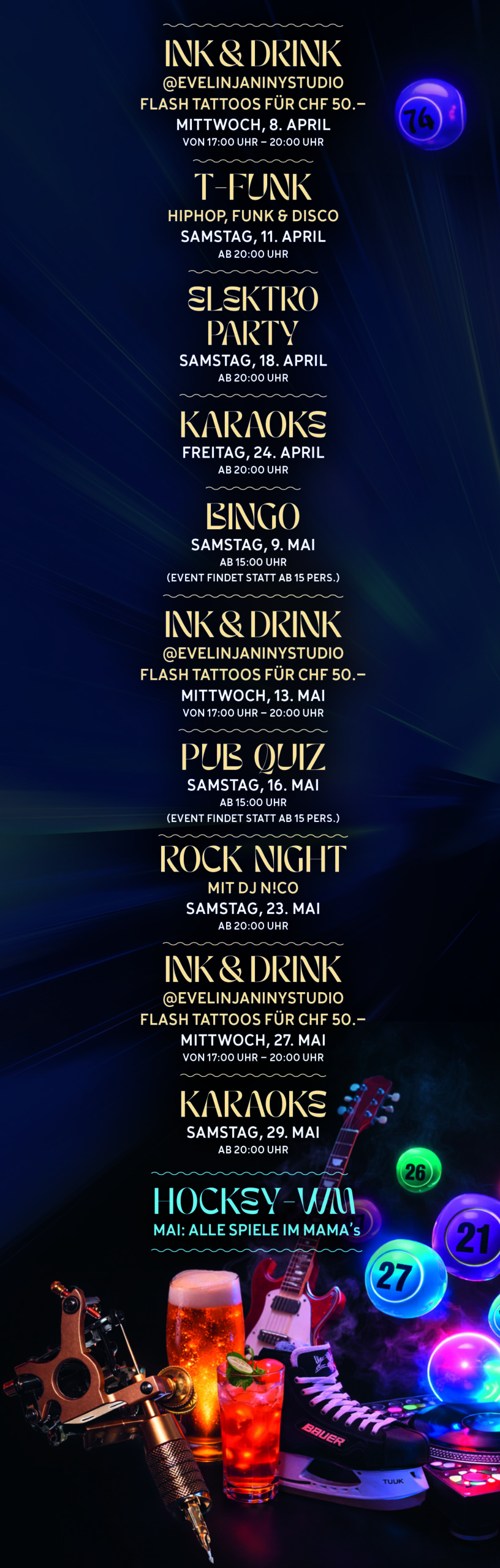 MAMA ist mehr als ein Café oder eine Bar. MAMA ist dein Wohnzimmer, dein Esszimmer, dein Spielzimmer und dein Garten im Herzen von Dübi. MAMA steht für feinen Kaffee & Gipfeli, frisch gezapftes Bier, schöne Weine und bombige Drinks. Ob tagsüber oder in der Nacht: MAMA zaubert dir stets ein Lächeln ins Gesicht und sorgt dafür, dass es dir gut geht. Weil MAMA dich so liebt, wie du bist.